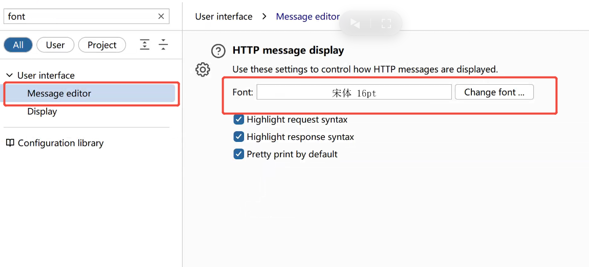 H01-启动和激活Burp https://wiki.bafangwy.com/doc/646/ Burp Suite中文乱码 https://wiki.bafangwy.com/doc/103/ # 原因分析 这个是字体大小的问题 # 解决办法 ## 旧版BP User Options —— Display —— HTTP Message ,设置字体大小 字体大小修改为14或者8的倍数,同时还需要改成中文字体:  ## 新版BP 右上角 Settings  User Interface —— Display —— Apperance —— font size  此外,把这个`Scaling`的`Scale Factor`设置为`1.0`  # 相关问题 BP光标字符选中会有误差 https://www.mashibing.com/question/detail/59788 参考资料: https://blog.csdn.net/m0_63756463/article/details/134878650