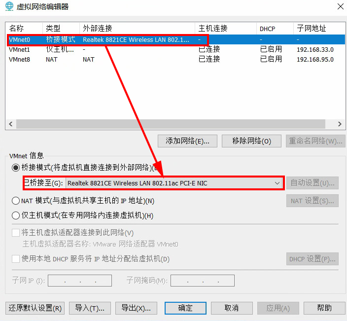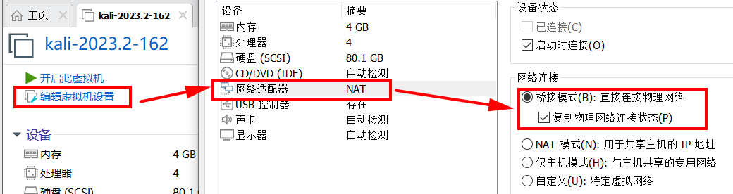 # 问题 课程:MSF kali启动了apache2(命令:service start apache2);在物理机访问 192.168.x.x/xxx.apk可以正常下载。 手机下载apk文件,显示无法连接 # 排查步骤 1、Kali虚拟机必须设置为桥接模式 修改网络模式以后确定保存,重启虚拟机  2、电脑和手机必须连接到同一个WiFi(或者路由器的有线网络) 注意:如果路由器有**访客网络**(名字里面带guest的),一定不要连接这个**访客网络** 3、在路由器管理界面,关闭路由器的“AP隔离”功能 比如腾达路由器:tplogin.cn登录进去,然后在“应用”里面找到“AP隔离”,设置为关闭,重启路由器 4、vmware网络设置 查看无线网卡名称: 在“计算机”上,右键——管理——设备管理器——网络适配器: 找到无线网卡设备名称(名字有WiFi或者 Wireless)  打开vmware——编辑——虚拟网络编辑器  更改设置:  修改:已桥接至——无线网卡名称