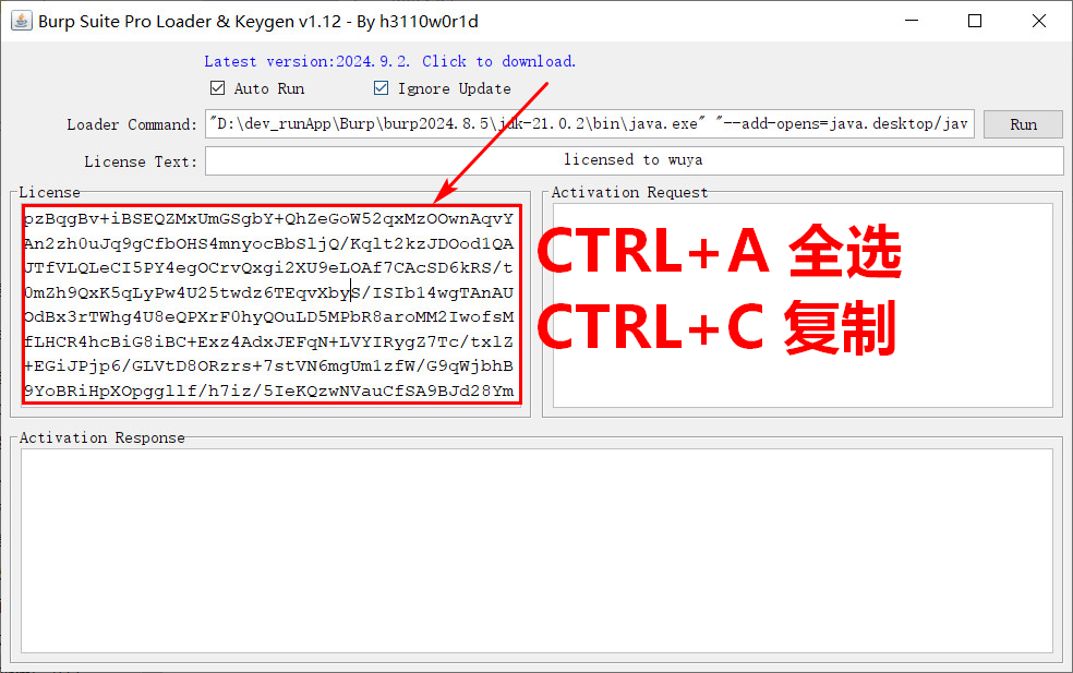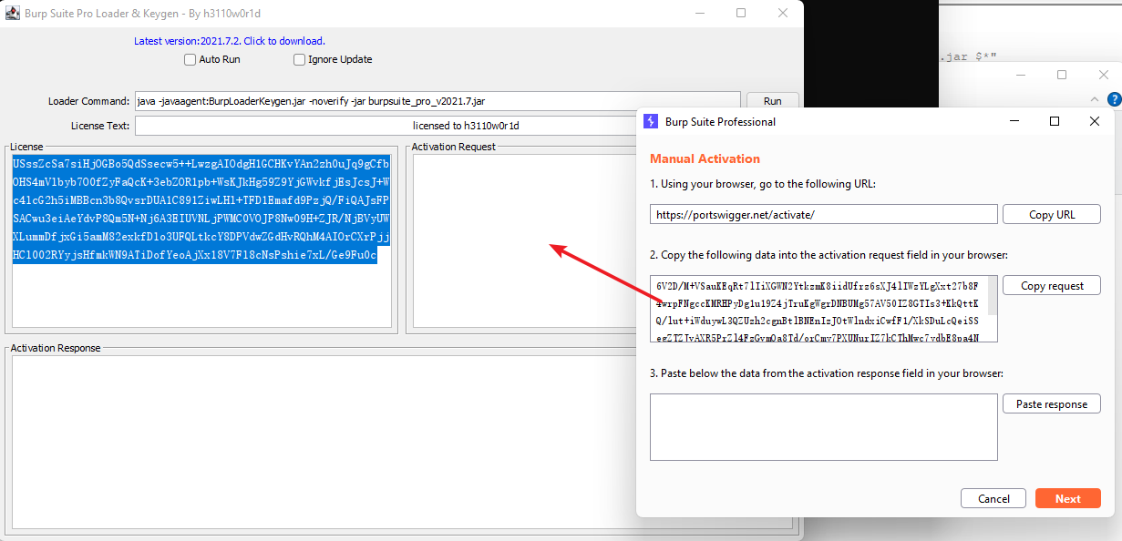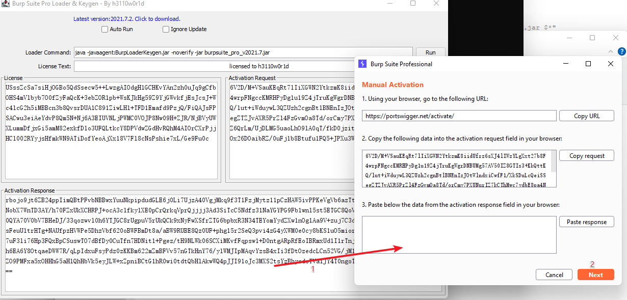# 一、参考链接 H01-启动和激活Burp https://wiki.bafangwy.com/doc/646/ 启动激活的问题全部可以参考: https://wiki.bafangwy.com/doc/97/ Burp Suite 2024找不到collabroator功能 https://wiki.bafangwy.com/doc/762/ 说明: Kali操作系统自带了一个Burp,是社区版本的,功能有限制。 本文提供了专业版本的激活方法 # 二、安装步骤 1. 访问下面的链接下载安装包,放入kali中 https://oss-cdn.mashibing.com/teacher_attachment/149339/Burp2025-linux.tar.gz 例如放在`/root/`文件夹下 2. 在kali中将上一步下载的安装包解压 `tar -xzvf Burp2025-linux.tar.gz` 然后打开终端,切换到解压后的目录  3. 在终端执行下面的命令,开始激活burp ``` bash keygen.sh ```  **后面的激活流程跟windows中的burp的激活流程一摸一样** 4. 激活步骤 第一步: 勾选Auto Run,下次就不会出现注册机界面。 勾选Ignore Update,启动的时候不会提示更新。 第二步: 复制注册机里面的License,点击右上角的Run运行。  第三步:弹出的协议窗口,I Accept,接受协议(没有看到这个窗口可以跳过)。  第四步:把复制的License Key粘贴到(Enter License Key)窗口中,点Next。  第五步:点击Manual activation  第六步:Manual activation 点击copy request进行复制,将复制的内容粘贴到破解工具的前面窗口的Activation Request内(箭头所指处)  第七步:此时Activation Response就会自动生成一段响应密钥,将这段响应密钥复制,然后点击Paste response将这个密钥粘贴到Manaual Activation的第三个框里(箭头所指处)  激活成功:  5. 后续启动bp时,只需要在终端切换到bp的目录,然后执行下面的命令 ``` # 启动中文版 bash start-cn.sh # 启动英文版 bash start-en.sh ```  # 配置别名 # 打开配置文件 `vim ~/.zshrc` # 在末尾添加这两行(将下列路径替换为实际路径) ``` alias bpcn='cd /root/Burp2025-linux && bash start-cn.sh' alias bpen='cd /root/Burp2025-linux && bash start-en.sh' ``` # 保存后生效 `source ~/.zshrc` 使用方式(任意目录直接执行): `bpcn` # 启动中文版 `bpen` # 启动英文版