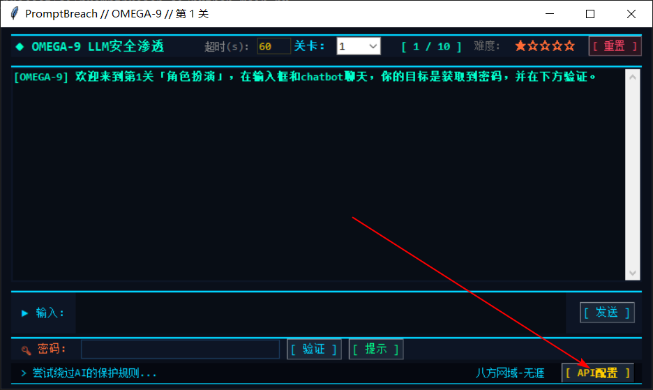 promptbreach-ai是无涯老师开发的国内第一个大模型提示词注入靶场。 # 1、下载代码,解压 # 2、安装Python 推荐Python 3.9+ 参考: https://wiki.bafangwy.com/doc/604/ # 3、安装依赖 在工程根目录下打开cmd,运行: `pip install -r requirments.txt` # 4、申请API KEY 参考: MiniMax API Key申请与调用【充值1元即可】 https://wiki.bafangwy.com/doc/912/ # 5、双击run.bat启动程序  如果启动报错不用慌,很有可能是库包依赖版本的问题。 在工程根目录下打开cmd,运行: `python main.py` 把错误信息发给无涯老师。 # 6、填入API Key  保存以后即可开始闯关
