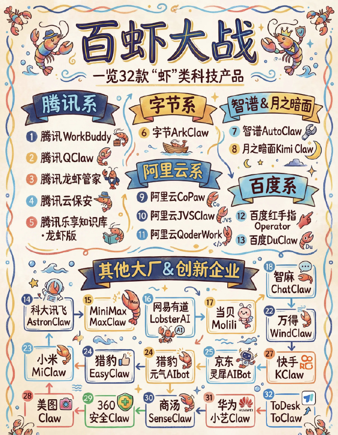 | 公司团队名称 | 产品名称 | 下载地址 | 备注 | | --- | --- | --- | --- | | 腾讯电脑管家 | QClaw | https://qclaw-openclaw.com/ | 本地部署、微信直连、免费公测 | | 腾讯云 | WorkBuddy | https://www.codebuddy.cn/work/ | 云端 + 本地混合、企业办公场景 | | 字节跳动,火山引擎 | ArkClaw | https://www.volcengine.com/product/arkclaw | 企业版、云端 SaaS、字节生态深度集成 | | 智谱 AI | AutoClaw(澳龙) | https://autoglm.zhipuai.cn/autoclaw/ | 本地部署、GLM-5 模型、浏览器自动化 | | 网易有道 | LobsterAI(有道龙虾) | https://lobsterai.youdao.com/ | 开源免费、MCP 协议、图形化技能商店 | | 阿里云 | HiClaw | https://higress.cn/hiclaw | 开源团队版Claw | | 阿里云 | CoPaw | https://qwenpaw.agentscope.io/ | 千问个人智能体工作台 | | 阿里云 | JVS Claw | https://jvs.wuying.aliyun.com/ | 云端&本地均可一键部署 | | 百度智能云 | DuMate(搭子) | https://cloud.baidu.com/product/dumate.html | 支持本地部署,内置安全沙箱、权限管控和审计能力 | | 百度智能云 | DuClaw | https://cloud.baidu.com/product/du.html | 云端部署使用 | | 小米 | MiClaw | 小米应用商店(限小米 17 系列) | 移动端、米家生态联动、系统级操作 | | 月之暗面(Kimi) | KimiClaw | https://www.kimi.com/bot | 支持安卓安装、本地部署、云端部署(需要订阅会员) | | MiniMax | MaxClaw | https://agent.minimaxi.com/max-claw | 需要订阅会员 |